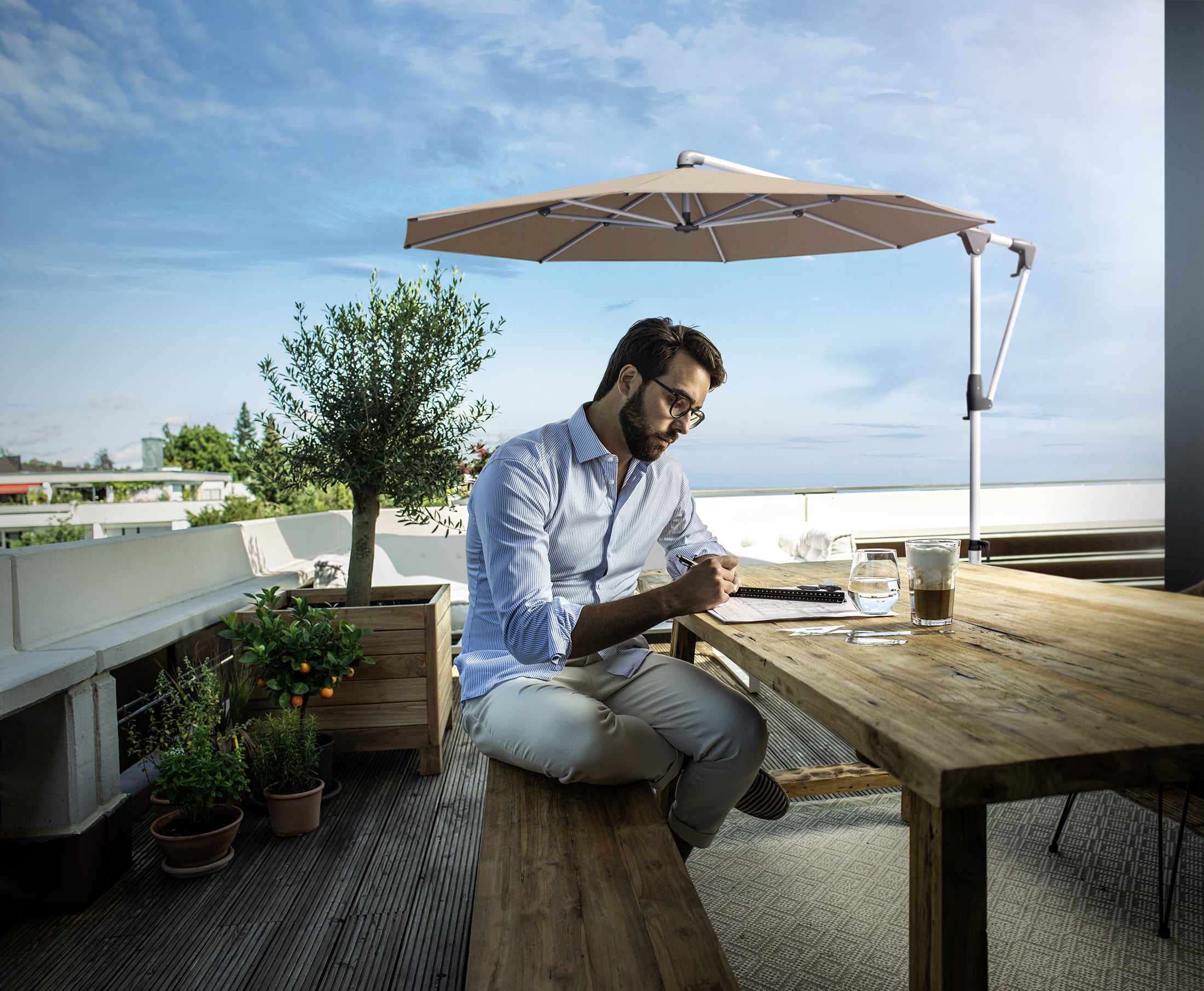 La tige de guidage permet d’incliner le toit du parasol des deux côtés jusqu’à 45°.